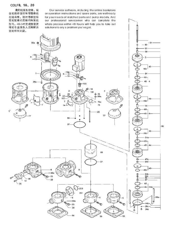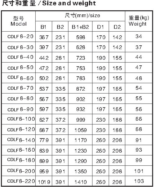 CDLF為安裝標準電機的非自吸立式多級離心泵,電機軸通過泵頭用聯軸器直接與泵軸聯接,拉桿螺栓將耐壓筒、過流部件固定在泵頭和進出水段之間,泵進出水口在泵底同一直線上;本泵可根據需要配置智能保護器,對泵干轉\缺相\過載等進行有效保護。